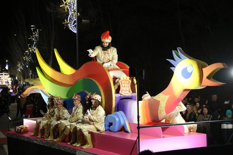 Va damunt d'una carrossa que representa una au màgica en moviment plena de colors i llum, acompanyat amb 12 patges.
