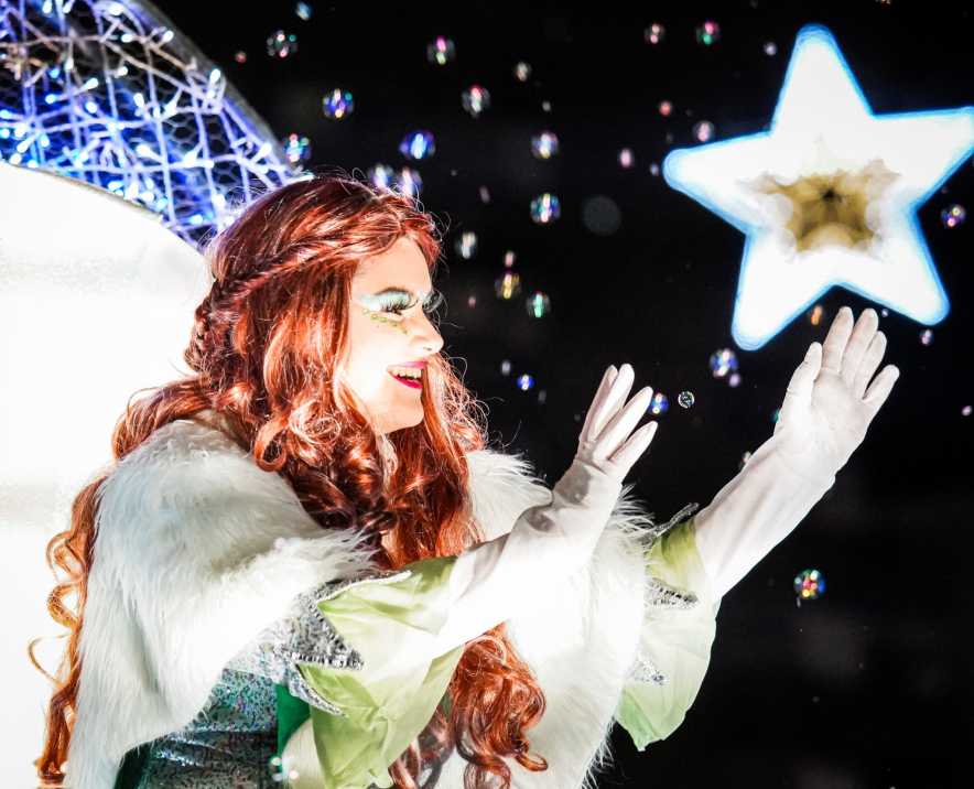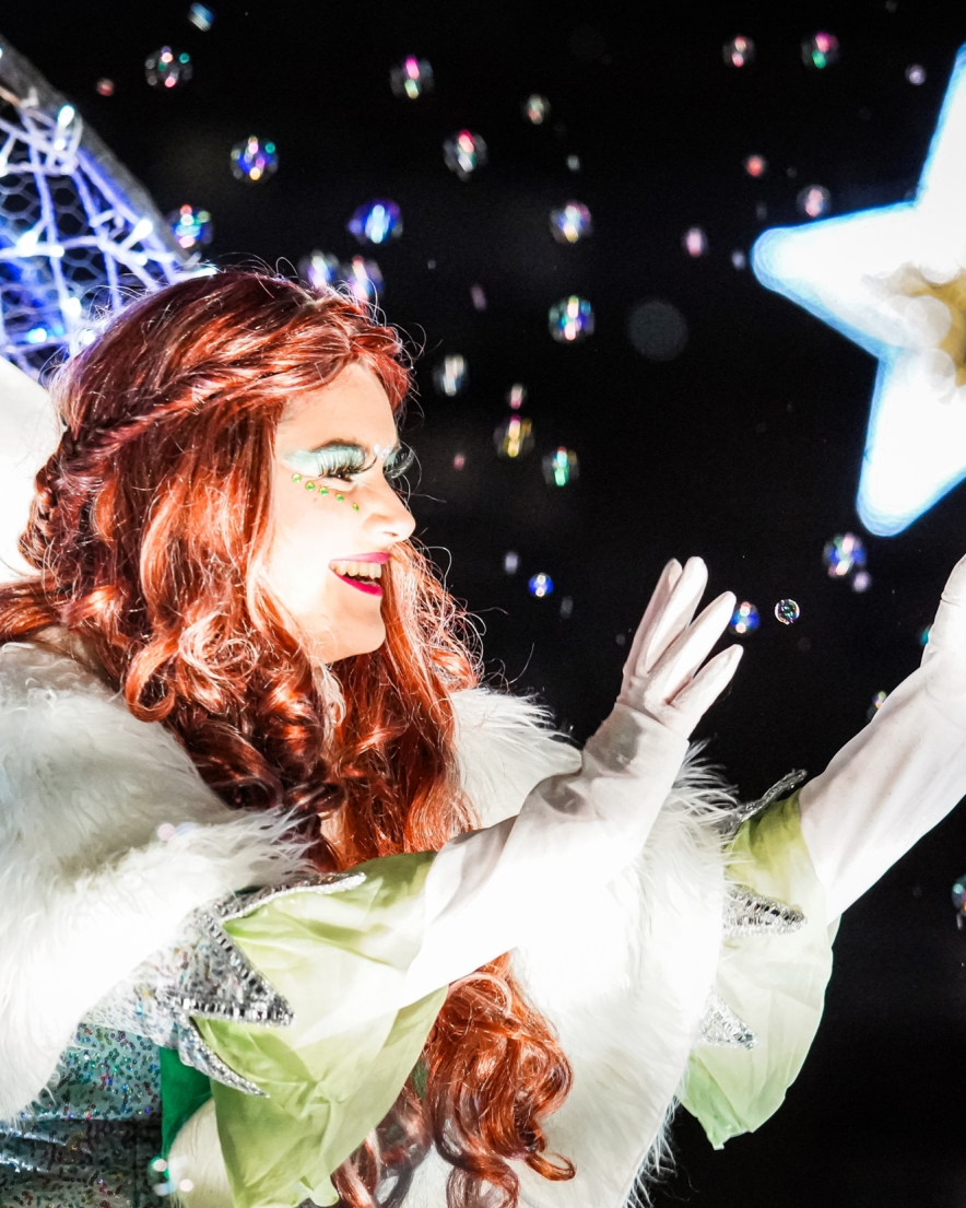 Va acompanyada amb 16 petits estels màgics que la cuiden durant tot el seu viatge damunt d'una carrossa il·luminada amb un gran estel blanc, repartint bombolles per on passa.